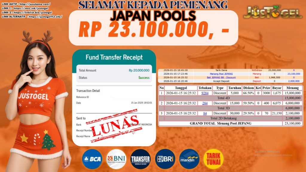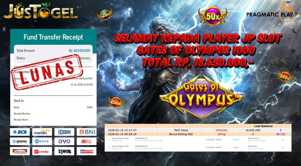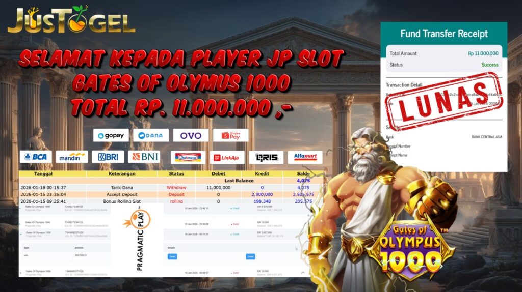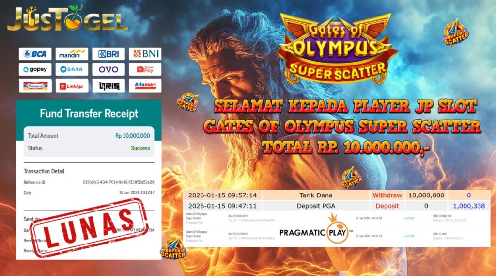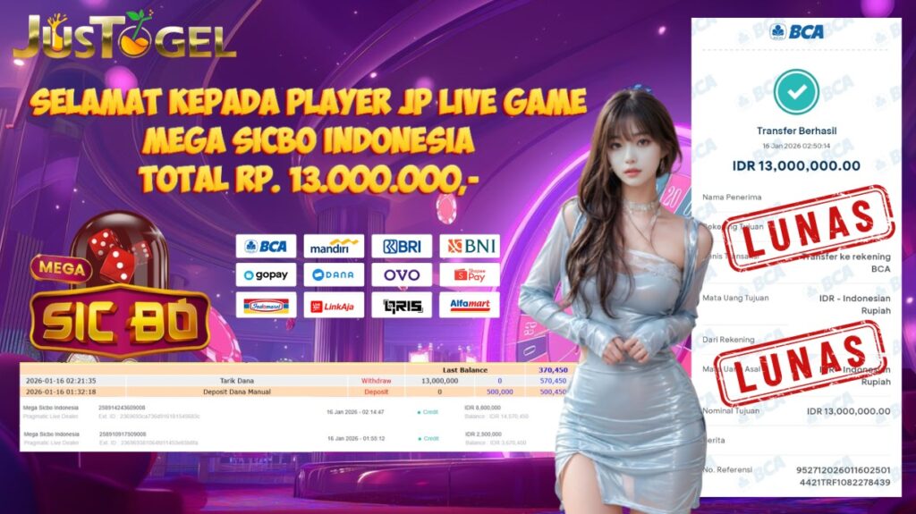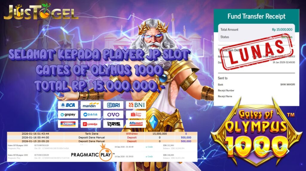 Selamat kepada User ID : DIT***HMH56 Telah berhasil mendapatkan kemenangan besar pada Permainan JP SLOT WILD BANDITO Dengan kemenangan Sebesar Rp. 10.200.000,- Setelah mengisi formulir withdraw dengan kurung waktu hanya 5-10 menit pihak JUSTOGEL sudah melakukan transfer kepada pemilik User ID dan dana sudah dapat di cairkan oleh pemenang. Bukti pembayaran yang kami berikan merupakan bukti pembayaran yang SAH / VALID yang langung di dapatkan melaui tanda transfer transaksi dari Bank yang di tuju.