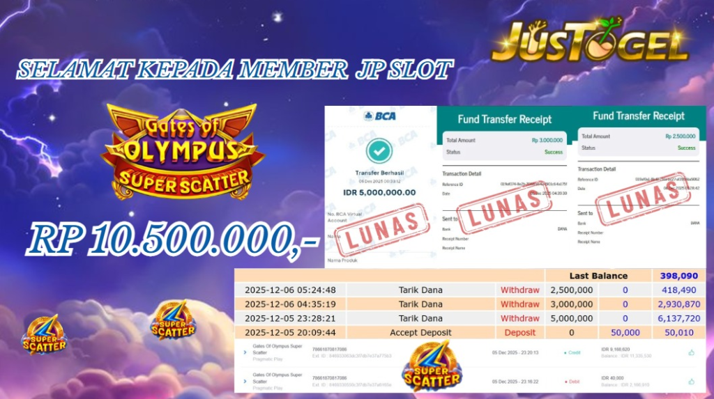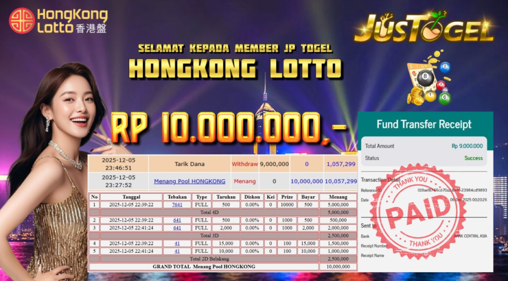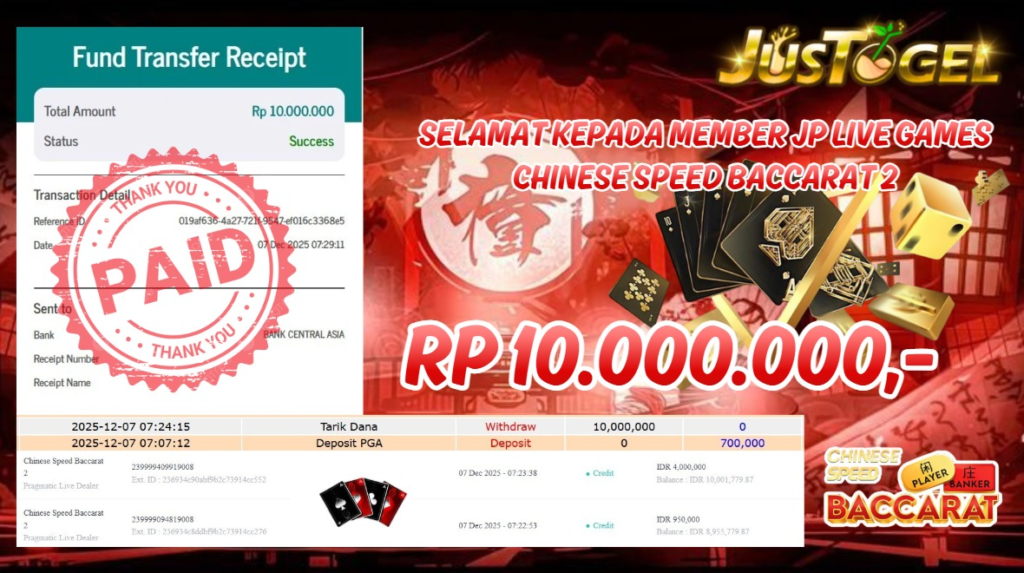Selamat kepada User ID : CHE***RN55 Telah berhasil mendapatkan kemenangan besar pada Permainan JP LIVE GAMES CHINESE SPEED BACCARAT 2 Dengan kemenangan Sebesar Rp 10.000.000,- Setelah mengisi formulir withdraw dengan kurung waktu hanya 5-10 menit pihak JUSTOGEL sudah melakukan transfer kepada pemilik User ID dan dana sudah dapat di cairkan oleh pemenang. Bukti pembayaran yang kami berikan merupakan bukti pembayaran yang SAH / VALID yang langung di dapatkan melaui tanda transfer transaksi dari Bank yang di tuju.