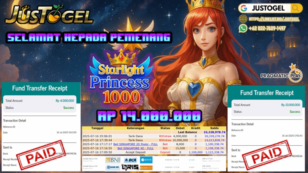 Selamat kepada User ID : EVEL***Y88 Telah berhasil mendapatkan kemenangan besar pada Permainan JP SLOT STARLIGHT PRINCESS 1000  Dengan kemenangan Sebesar Rp 14.000.000,- Setelah mengisi formulir withdraw dengan kurung waktu hanya 5-10 menit pihak JUSTOGEL sudah melakukan transfer kepada pemilik User ID dan dana sudah dapat di cairkan oleh pemenang. Bukti pembayaran yang kami berikan merupakan bukti pembayaran yang SAH / VALID yang langung di dapatkan melaui tanda transfer transaksi dari Bank yang di tuju.