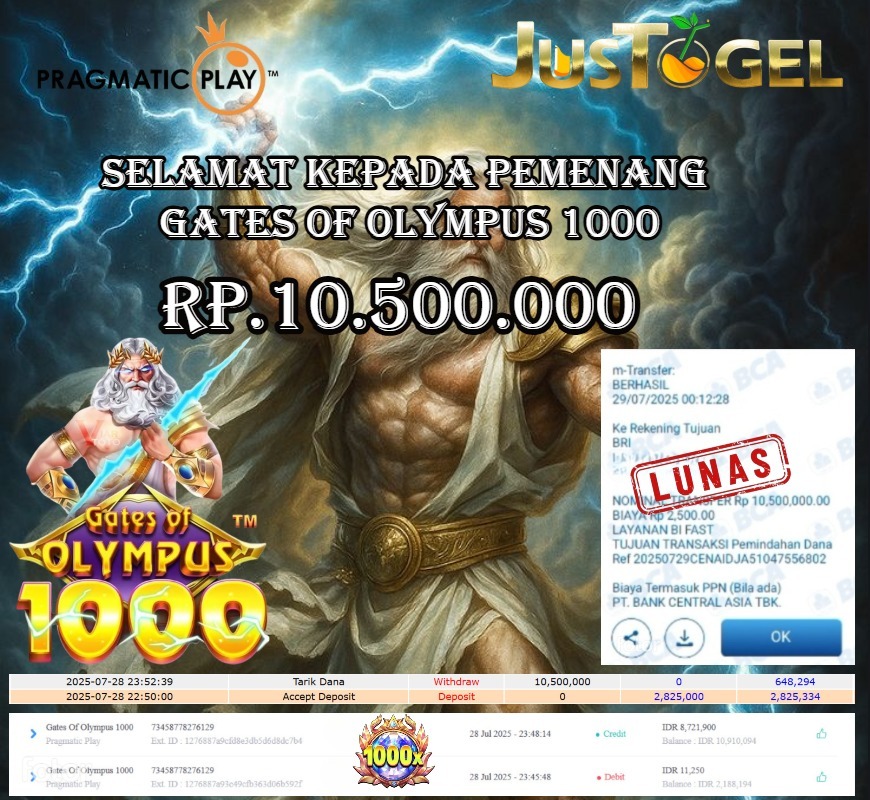 Selamat kepada User ID : YUS**AN Telah berhasil mendapatkan kemenangan besar pada Permainan JP SLOT GATES OF OLYMPUS 1000 Dengan kemenangan Sebesar Rp 10.500.000,- Setelah mengisi formulir withdraw dengan kurung waktu hanya 5-10 menit pihak JUSTOGEL sudah melakukan transfer kepada pemilik User ID dan dana sudah dapat di cairkan oleh pemenang. Bukti pembayaran yang kami berikan merupakan bukti pembayaran yang SAH / VALID yang langung di dapatkan melaui tanda transfer transaksi dari Bank yang di tuju.