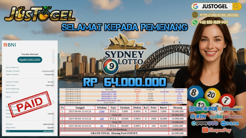 Selamat kepada User ID : CU***AI Telah berhasil mendapatkan kemenangan besar pada Permainan JP TOGEL SYDNEY LOTTO Dengan kemenangan Sebesar Rp 64.000.000,- Setelah mengisi formulir withdraw dengan kurung waktu hanya 5-10 menit pihak JUSTOGEL sudah melakukan transfer kepada pemilik User ID dan dana sudah dapat di cairkan oleh pemenang. Bukti pembayaran yang kami berikan merupakan bukti pembayaran yang SAH / VALID yang langung di dapatkan melaui tanda transfer transaksi dari Bank yang di tuju.