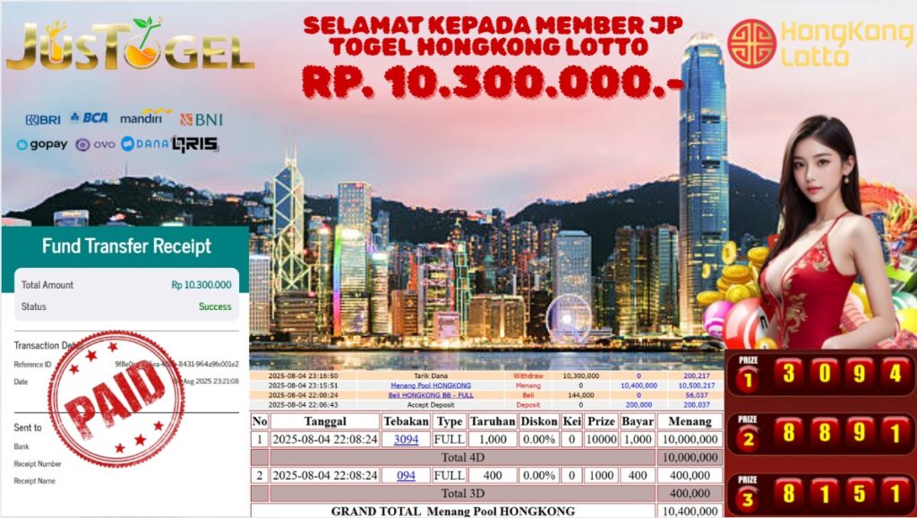 Selamat kepada User ID : DAD***NG Telah berhasil mendapatkan kemenangan besar pada Permainan JP TOGEL HONGKONG LOTTO Dengan kemenangan Sebesar Rp 10.300.000,- Setelah mengisi formulir withdraw dengan kurung waktu hanya 5-10 menit pihak JUSTOGEL sudah melakukan transfer kepada pemilik User ID dan dana sudah dapat di cairkan oleh pemenang. Bukti pembayaran yang kami berikan merupakan bukti pembayaran yang SAH / VALID yang langung di dapatkan melaui tanda transfer transaksi dari Bank yang di tuju.