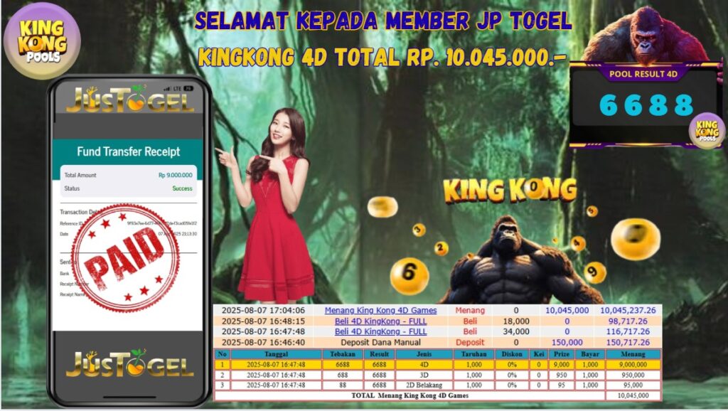 SELAMAT KEPADA MEMBER JP TOGEL KINGKONG 4D TOTAL 10.045.000 LUNAS
