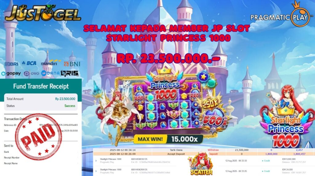 Selamat kepada User ID : MAK***02 Telah berhasil mendapatkan kemenangan besar pada Permainan JP SLOT STARLIGHT PRINCESS 1000 Dengan kemenangan Sebesar Rp 23.500.000,- Setelah mengisi formulir withdraw dengan kurung waktu hanya 5-10 menit pihak JUSTOGEL sudah melakukan transfer kepada pemilik User ID dan dana sudah dapat di cairkan oleh pemenang. Bukti pembayaran yang kami berikan merupakan bukti pembayaran yang SAH / VALID yang langung di dapatkan melaui tanda transfer transaksi dari Bank yang di tuju.