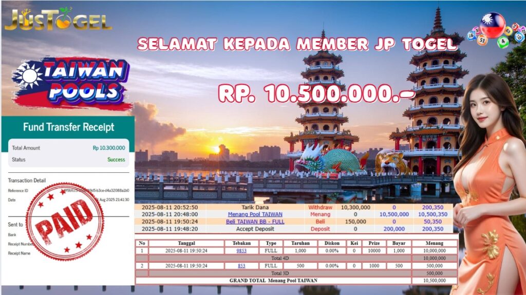 Selamat kepada User ID : JEN***GER Telah berhasil mendapatkan kemenangan besar pada Permainan JP TOGEL TAIWAN Dengan kemenangan Sebesar Rp10.500.000,- Setelah mengisi formulir withdraw dengan kurung waktu hanya 5-10 menit pihak JUSTOGEL sudah melakukan transfer kepada pemilik User ID dan dana sudah dapat di cairkan oleh pemenang. Bukti pembayaran yang kami berikan merupakan bukti pembayaran yang SAH / VALID yang langung di dapatkan melaui tanda transfer transaksi dari Bank yang di tuju.