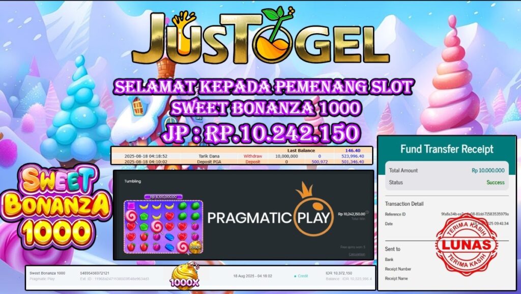 Selamat kepada User ID : AMA***YHN Telah berhasil mendapatkan kemenangan besar pada Permainan JP SLOT SWEET BONANZA 1000 Dengan kemenangan Sebesar Rp 10.242.150.– Setelah mengisi formulir withdraw dengan kurung waktu hanya 5-10 menit pihak JUSTOGEL sudah melakukan transfer kepada pemilik User ID dan dana sudah dapat di cairkan oleh pemenang. Bukti pembayaran yang kami berikan merupakan bukti pembayaran yang SAH / VALID yang langung di dapatkan melaui tanda transfer transaksi dari Bank yang di tuju.