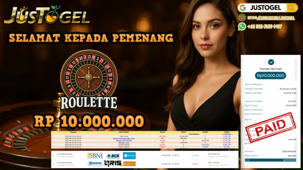 Selamat kepada User ID : AL***TO Telah berhasil mendapatkan kemenangan besar pada Permainan JP LIVE GAME ROULETTE Dengan kemenangan Sebesar Rp 10.000.000,- Setelah mengisi formulir withdraw dengan kurung waktu hanya 5-10 menit pihak JUSTOGEL sudah melakukan transfer kepada pemilik User ID dan dana sudah dapat di cairkan oleh pemenang. Bukti pembayaran yang kami berikan merupakan bukti pembayaran yang SAH / VALID yang langung di dapatkan melaui tanda transfer transaksi dari Bank yang di tuju.