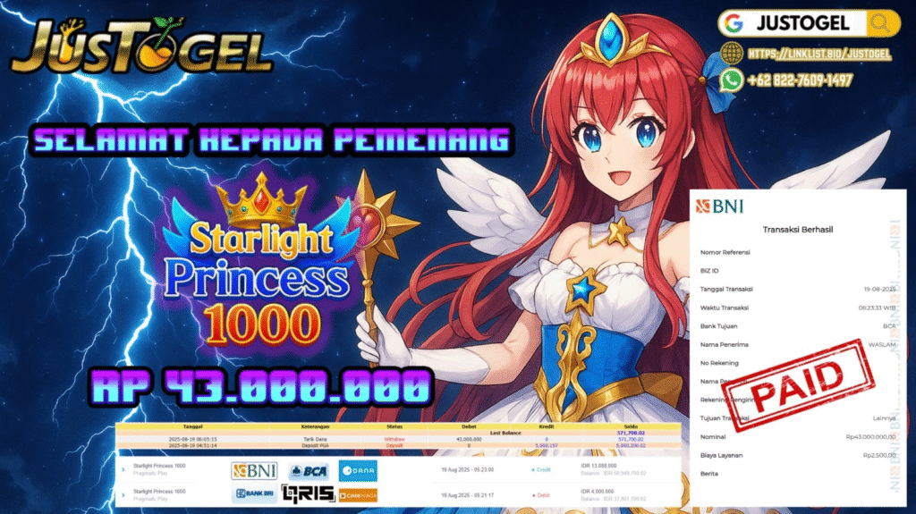 Selamat kepada User ID : TR***0WD Telah berhasil mendapatkan kemenangan besar pada Permainan JP SLOT STARLIGHT PRINCESS Dengan kemenangan Sebesar Rp 43.000.000.– Setelah mengisi formulir withdraw dengan kurung waktu hanya 5-10 menit pihak JUSTOGEL sudah melakukan transfer kepada pemilik User ID dan dana sudah dapat di cairkan oleh pemenang. Bukti pembayaran yang kami berikan merupakan bukti pembayaran yang SAH / VALID yang langung di dapatkan melaui tanda transfer transaksi dari Bank yang di tuju.