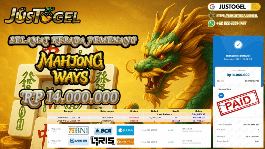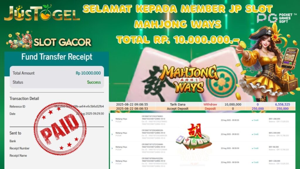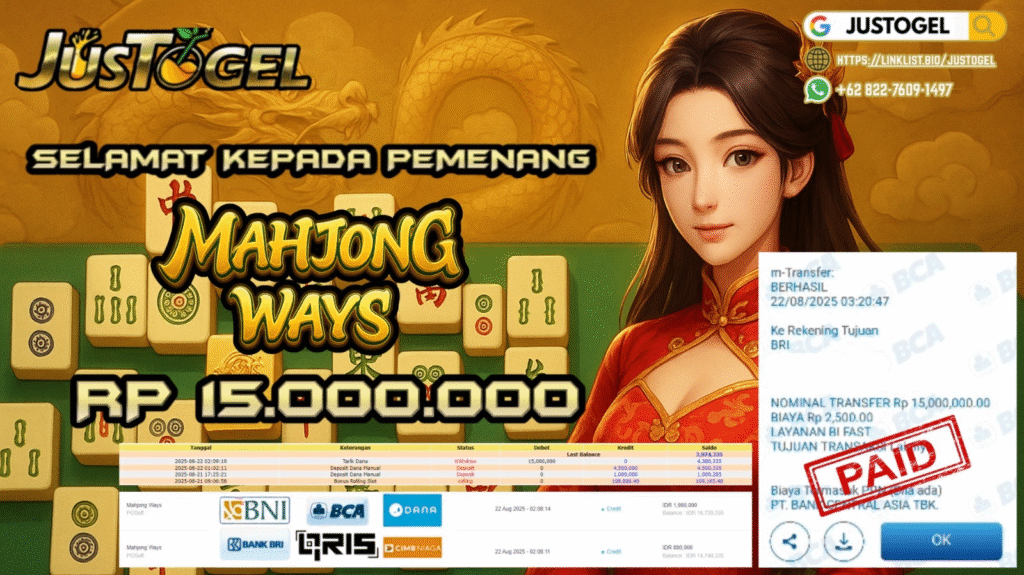 Selamat kepada User ID : ASS***RA Telah berhasil mendapatkan kemenangan besar pada Permainan JP SLOT MAHJONG WAYS2 Dengan kemenangan Sebesar Rp 15.000.000,- Setelah mengisi formulir withdraw dengan kurung waktu hanya 5-10 menit pihak JUSTOGEL sudah melakukan transfer kepada pemilik User ID dan dana sudah dapat di cairkan oleh pemenang. Bukti pembayaran yang kami berikan merupakan bukti pembayaran yang SAH / VALID yang langung di dapatkan melaui tanda transfer transaksi dari Bank yang di tuju.