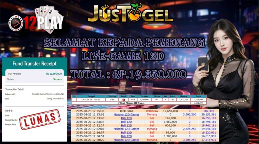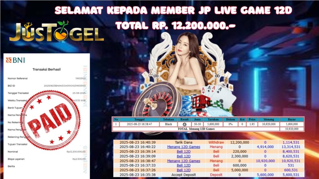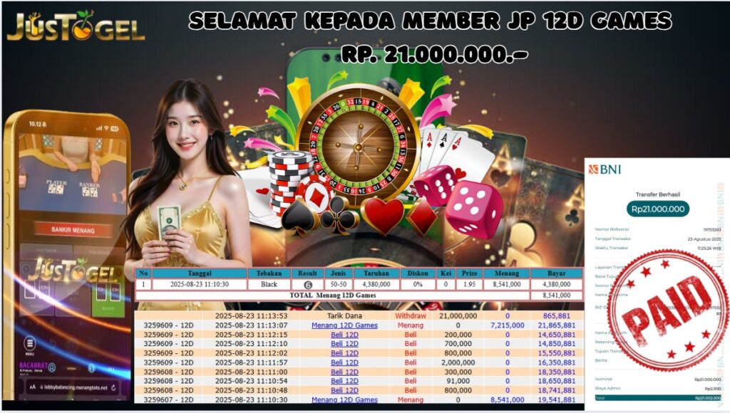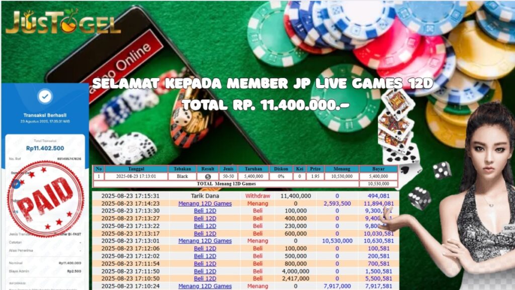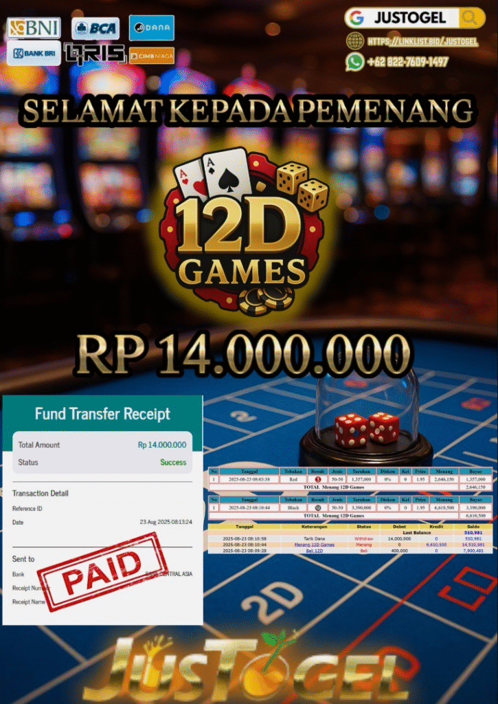 Selamat kepada User ID : SAR***TO Telah berhasil mendapatkan kemenangan besar pada Permainan JP LIVE GAME 12D GAMES Dengan kemenangan Sebesar Rp 15.400.000,- Setelah mengisi formulir withdraw dengan kurung waktu hanya 5-10 menit pihak JUSTOGEL sudah melakukan transfer kepada pemilik User ID dan dana sudah dapat di cairkan oleh pemenang. Bukti pembayaran yang kami berikan merupakan bukti pembayaran yang SAH / VALID yang langung di dapatkan melaui tanda transfer transaksi dari Bank yang di tuju.