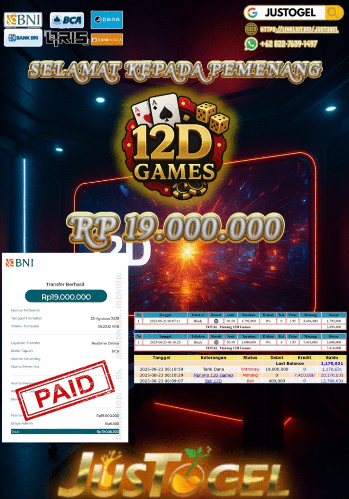 Selamat kepada User ID : SEP***NNN Telah berhasil mendapatkan kemenangan besar pada Permainan JP LIVE GAME 12D GAMES Dengan kemenangan Sebesar Rp 19.000.000,- Setelah mengisi formulir withdraw dengan kurung waktu hanya 5-10 menit pihak JUSTOGEL sudah melakukan transfer kepada pemilik User ID dan dana sudah dapat di cairkan oleh pemenang. Bukti pembayaran yang kami berikan merupakan bukti pembayaran yang SAH / VALID yang langung di dapatkan melaui tanda transfer transaksi dari Bank yang di tuju.