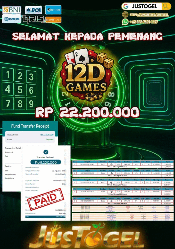Selamat kepada User ID : MO***N202 Telah berhasil mendapatkan kemenangan besar pada Permainan JP LIVE GAME 12D GAMES Dengan kemenangan Sebesar Rp 22.200.000,- Setelah mengisi formulir withdraw dengan kurung waktu hanya 5-10 menit pihak JUSTOGEL sudah melakukan transfer kepada pemilik User ID dan dana sudah dapat di cairkan oleh pemenang. Bukti pembayaran yang kami berikan merupakan bukti pembayaran yang SAH / VALID yang langung di dapatkan melaui tanda transfer transaksi dari Bank yang di tuju.