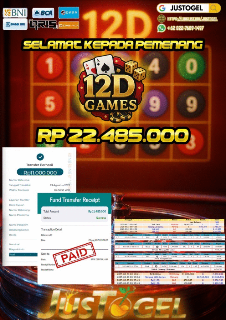 Selamat kepada User ID : GOR***K Telah berhasil mendapatkan kemenangan besar pada Permainan JP LIVE GAME 12D GAMES Dengan kemenangan Sebesar Rp 22.485.000,- Setelah mengisi formulir withdraw dengan kurung waktu hanya 5-10 menit pihak JUSTOGEL sudah melakukan transfer kepada pemilik User ID dan dana sudah dapat di cairkan oleh pemenang. Bukti pembayaran yang kami berikan merupakan bukti pembayaran yang SAH / VALID yang langung di dapatkan melaui tanda transfer transaksi dari Bank yang di tuju.