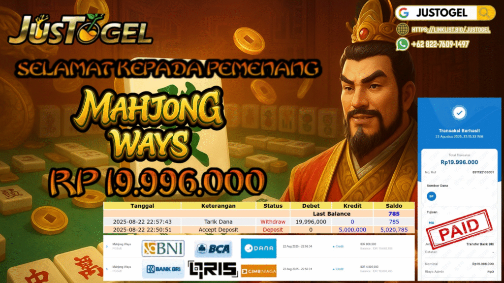 Selamat kepada User ID : GEN***WO Telah berhasil mendapatkan kemenangan besar pada Permainan JP SLOT MAHJONG WAYS Dengan kemenangan Sebesar Rp 19.996.000,- Setelah mengisi formulir withdraw dengan kurung waktu hanya 5-10 menit pihak JUSTOGEL sudah melakukan transfer kepada pemilik User ID dan dana sudah dapat di cairkan oleh pemenang. Bukti pembayaran yang kami berikan merupakan bukti pembayaran yang SAH / VALID yang langung di dapatkan melaui tanda transfer transaksi dari Bank yang di tuju.