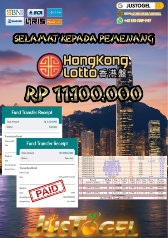 Selamat kepada User ID : WA***PPP Telah berhasil mendapatkan kemenangan besar pada Permainan JP TOGEL HONGKONG LOTTO Dengan kemenangan Sebesar Rp 11.100.000,- Setelah mengisi formulir withdraw dengan kurung waktu hanya 5-10 menit pihak JUSTOGEL sudah melakukan transfer kepada pemilik User ID dan dana sudah dapat di cairkan oleh pemenang. Bukti pembayaran yang kami berikan merupakan bukti pembayaran yang SAH / VALID yang langung di dapatkan melaui tanda transfer transaksi dari Bank yang di tuju.