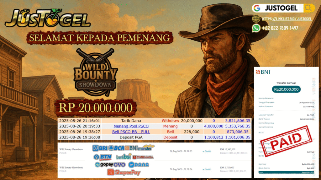 Selamat kepada User ID : SO***YO Telah berhasil mendapatkan kemenangan besar pada Permainan JP SLOT WILD BOUNT SHOWDOWN Dengan kemenangan Sebesar Rp 20.000.000,- Setelah mengisi formulir withdraw dengan kurung waktu hanya 5-10 menit pihak JUSTOGEL sudah melakukan transfer kepada pemilik User ID dan dana sudah dapat di cairkan oleh pemenang. Bukti pembayaran yang kami berikan merupakan bukti pembayaran yang SAH / VALID yang langung di dapatkan melaui tanda transfer transaksi dari Bank yang di tuju.