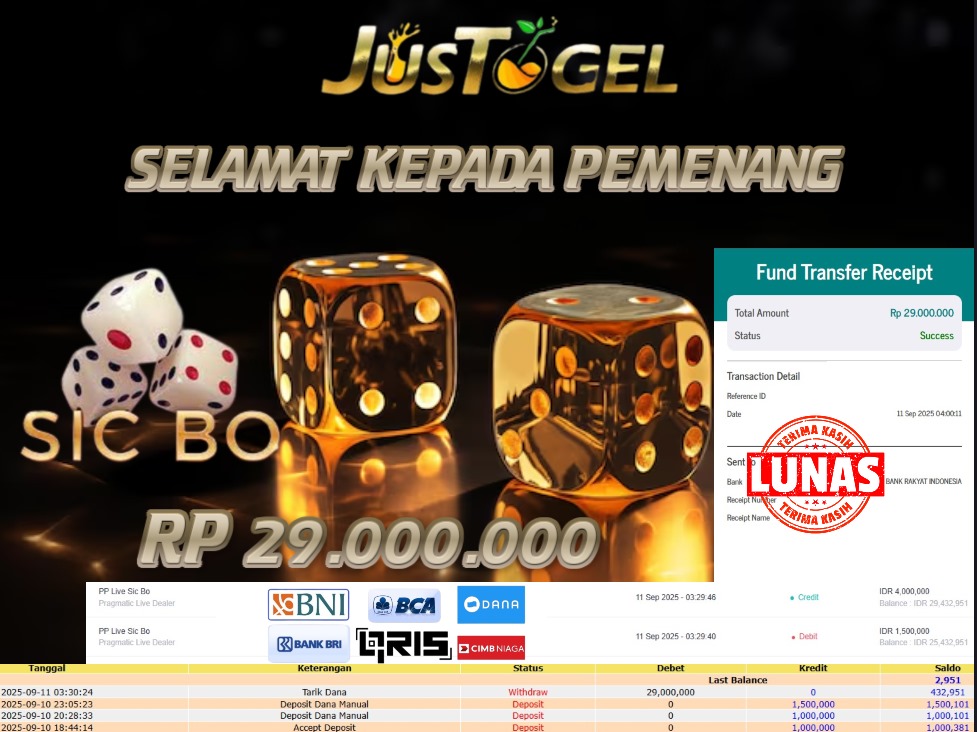 Selamat kepada User ID : DARE***N77 Telah berhasil mendapatkan kemenangan besar pada Permainan JP LIVE SICBO Dengan kemenangan Sebesar Rp 29.000.000,- Setelah mengisi formulir withdraw dengan kurung waktu hanya 5-10 menit pihak JUSTOGEL sudah melakukan transfer kepada pemilik User ID dan dana sudah dapat di cairkan oleh pemenang. Bukti pembayaran yang kami berikan merupakan bukti pembayaran yang SAH / VALID yang langung di dapatkan melaui tanda transfer transaksi dari Bank yang di tuju.