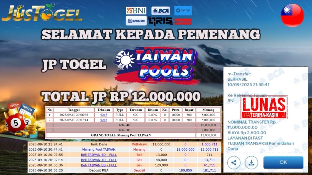 Selamat kepada User ID : LEMO***991 Telah berhasil mendapatkan kemenangan besar pada Permainan JP TOGEL TAIWAN Dengan kemenangan Sebesar Rp 12.000.000,- Setelah mengisi formulir withdraw dengan kurung waktu hanya 5-10 menit pihak JUSTOGEL sudah melakukan transfer kepada pemilik User ID dan dana sudah dapat di cairkan oleh pemenang. Bukti pembayaran yang kami berikan merupakan bukti pembayaran yang SAH / VALID yang langung di dapatkan melaui tanda transfer transaksi dari Bank yang di tuju.