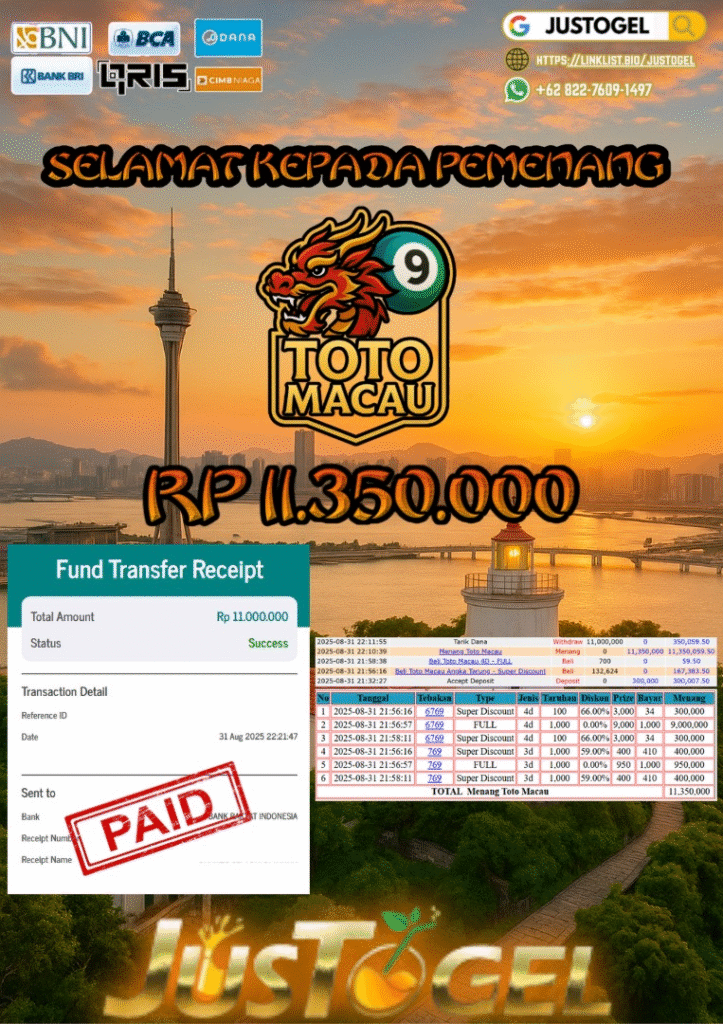 Selamat kepada User ID : RE***GA Telah berhasil mendapatkan kemenangan besar pada Permainan JP TOGEL TOTO MACAU Dengan kemenangan Sebesar Rp 11.350.000,- Setelah mengisi formulir withdraw dengan kurung waktu hanya 5-10 menit pihak JUSTOGEL sudah melakukan transfer kepada pemilik User ID dan dana sudah dapat di cairkan oleh pemenang. Bukti pembayaran yang kami berikan merupakan bukti pembayaran yang SAH / VALID yang langung di dapatkan melaui tanda transfer transaksi dari Bank yang di tuju.