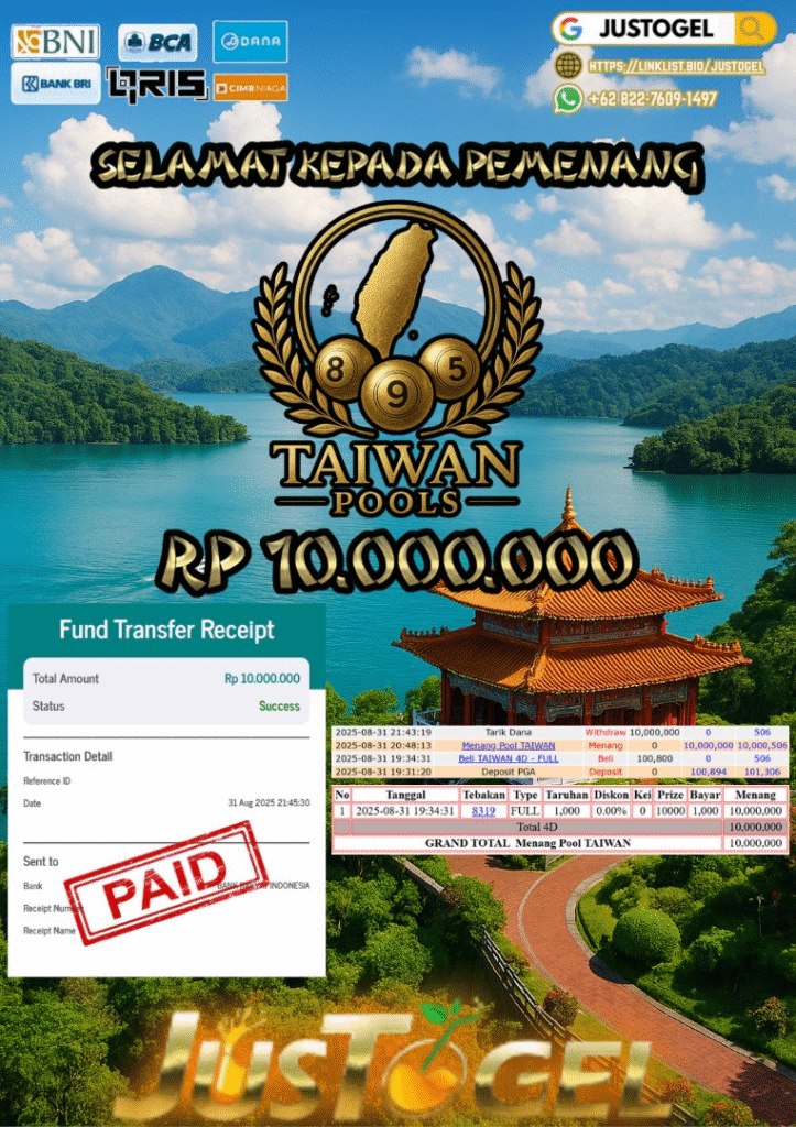 Selamat kepada User ID : RE***GA Telah berhasil mendapatkan kemenangan besar pada Permainan JP TOGEL TOTO MACAU Dengan kemenangan Sebesar Rp 11.350.000,- Setelah mengisi formulir withdraw dengan kurung waktu hanya 5-10 menit pihak JUSTOGEL sudah melakukan transfer kepada pemilik User ID dan dana sudah dapat di cairkan oleh pemenang. Bukti pembayaran yang kami berikan merupakan bukti pembayaran yang SAH / VALID yang langung di dapatkan melaui tanda transfer transaksi dari Bank yang di tuju.