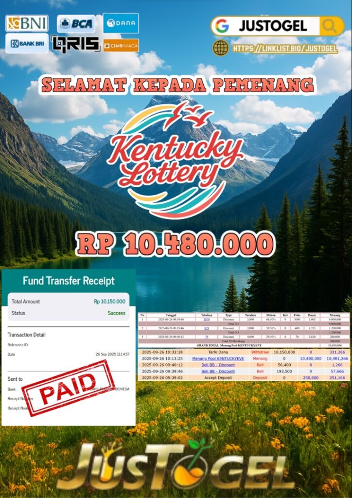 Selamat kepada User ID : NG***HH Telah berhasil mendapatkan kemenangan besar pada Permainan JP TOGEL KENTUCKY EVE Dengan kemenangan Sebesar Rp 10.480.000,- Setelah mengisi formulir withdraw dengan kurung waktu hanya 5-10 menit pihak JUSTOGEL sudah melakukan transfer kepada pemilik User ID dan dana sudah dapat di cairkan oleh pemenang. Bukti pembayaran yang kami berikan merupakan bukti pembayaran yang SAH / VALID yang langung di dapatkan melaui tanda transfer transaksi dari Bank yang di tuju.