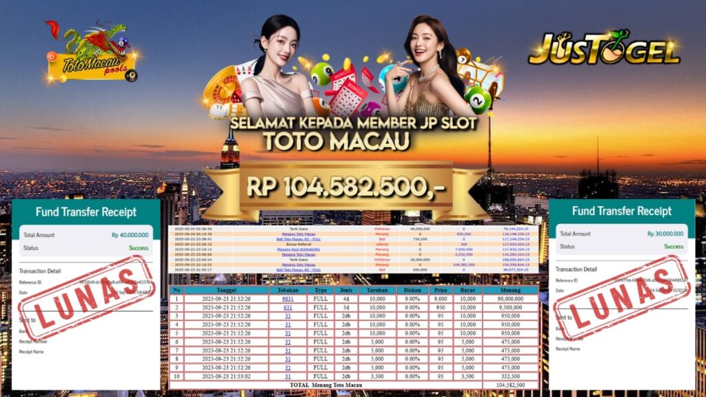 SELAMAT KEPADA MEMBER JP TOGEL TOTO MACAU TOTAL Rp. 104.582.500.- LUNAS
