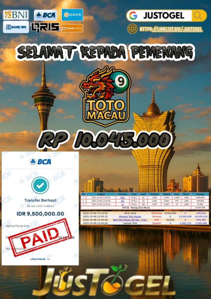 SELAMAT KEPADA MEMBER JP TOGEL TOTO MACAU TOTAL Rp. 10.045.000.- LUNAS
