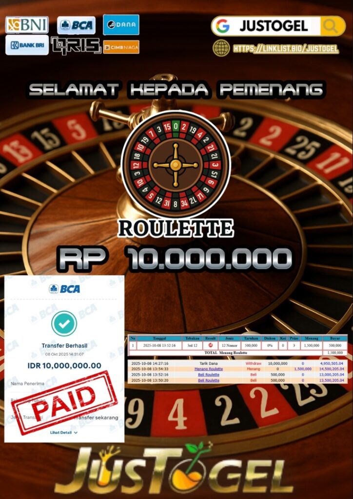 Selamat kepada User ID : GE***G22 Telah berhasil mendapatkan kemenangan besar pada Permainan JP LIVE GAME ROULETTE Dengan kemenangan Sebesar Rp 10.000.000,- Setelah mengisi formulir withdraw dengan kurung waktu hanya 5-10 menit pihak JUSTOGEL sudah melakukan transfer kepada pemilik User ID dan dana sudah dapat di cairkan oleh pemenang. Bukti pembayaran yang kami berikan merupakan bukti pembayaran yang SAH / VALID yang langung di dapatkan melaui tanda transfer transaksi dari Bank yang di tuju.