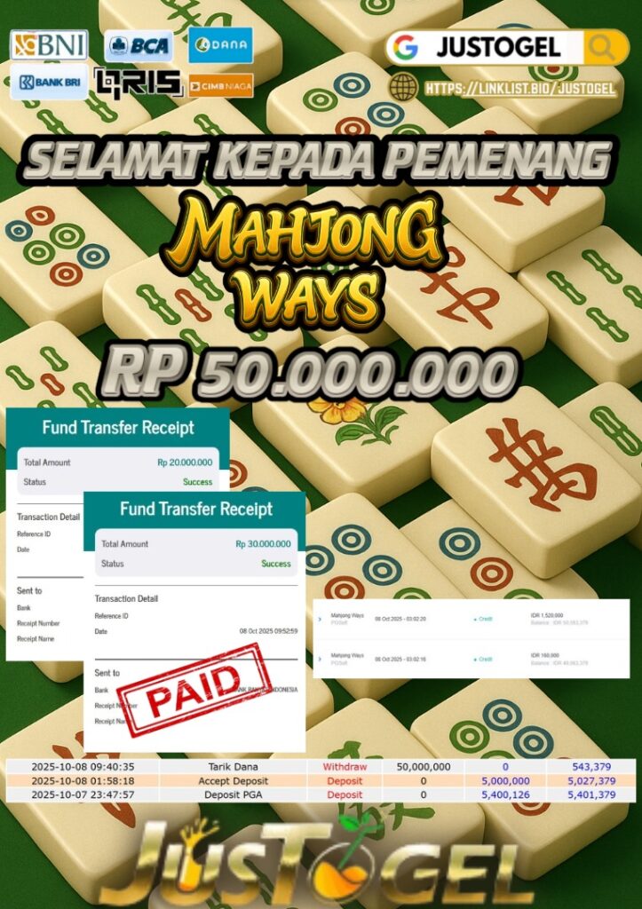 Selamat kepada User ID : LO***GTL Telah berhasil mendapatkan kemenangan besar pada Permainan JP SLOT MAHJONG WAYS Dengan kemenangan Sebesar Rp 50.000.000,- Setelah mengisi formulir withdraw dengan kurung waktu hanya 5-10 menit pihak JUSTOGEL sudah melakukan transfer kepada pemilik User ID dan dana sudah dapat di cairkan oleh pemenang. Bukti pembayaran yang kami berikan merupakan bukti pembayaran yang SAH / VALID yang langung di dapatkan melaui tanda transfer transaksi dari Bank yang di tuju.