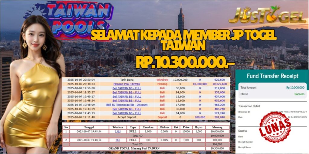 Selamat kepada User ID : AN***IA7 Telah berhasil mendapatkan kemenangan besar pada Permainan JP TOGEL TAIWAN POOLS Dengan kemenangan Sebesar Rp 10.300.000,- Setelah mengisi formulir withdraw dengan kurung waktu hanya 5-10 menit pihak JUSTOGEL sudah melakukan transfer kepada pemilik User ID dan dana sudah dapat di cairkan oleh pemenang. Bukti pembayaran yang kami berikan merupakan bukti pembayaran yang SAH / VALID yang langung di dapatkan melaui tanda transfer transaksi dari Bank yang di tuju.