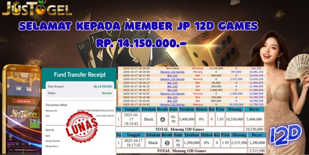 Selamat kepada User ID : NA***ROT Telah berhasil mendapatkan kemenangan besar pada Permainan JP LIVE GAMES 12D Dengan kemenangan Sebesar Rp 14.150.000,- Setelah mengisi formulir withdraw dengan kurung waktu hanya 5-10 menit pihak JUSTOGEL sudah melakukan transfer kepada pemilik User ID dan dana sudah dapat di cairkan oleh pemenang. Bukti pembayaran yang kami berikan merupakan bukti pembayaran yang SAH / VALID yang langung di dapatkan melaui tanda transfer transaksi dari Bank yang di tuju.