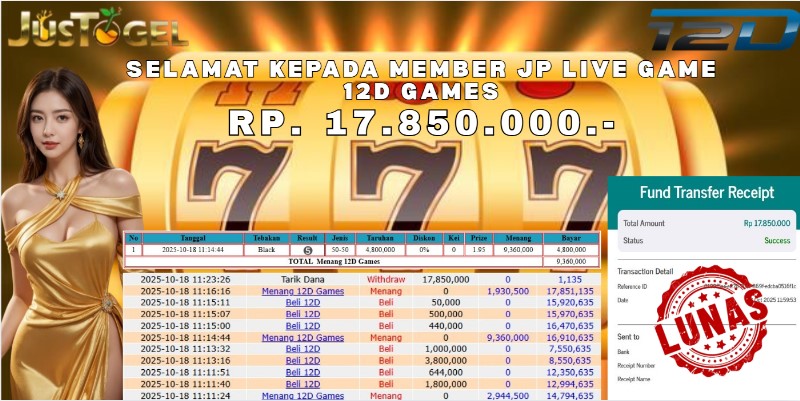 Selamat kepada User ID : KOD***88 Telah berhasil mendapatkan kemenangan besar pada Permainan JP LIVE GAME 12D GAMES Dengan kemenangan Sebesar Rp 17.850.000,- Setelah mengisi formulir withdraw dengan kurung waktu hanya 5-10 menit pihak JUSTOGEL sudah melakukan transfer kepada pemilik User ID dan dana sudah dapat di cairkan oleh pemenang. Bukti pembayaran yang kami berikan merupakan bukti pembayaran yang SAH / VALID yang langung di dapatkan melaui tanda transfer transaksi dari Bank yang di tuju.