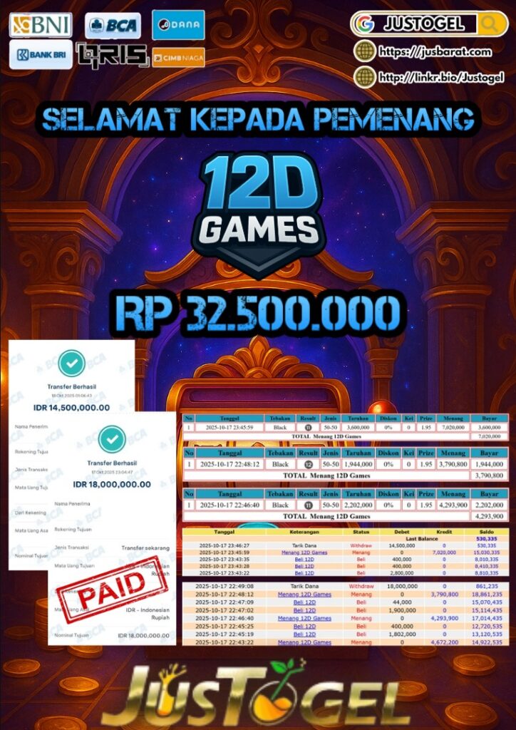 Selamat kepada User ID : CU***AI0 Telah berhasil mendapatkan kemenangan besar pada Permainan JP LIVE GAME 12D GAMES Dengan kemenangan Sebesar Rp 32.500.000,- Setelah mengisi formulir withdraw dengan kurung waktu hanya 5-10 menit pihak JUSTOGEL sudah melakukan transfer kepada pemilik User ID dan dana sudah dapat di cairkan oleh pemenang. Bukti pembayaran yang kami berikan merupakan bukti pembayaran yang SAH / VALID yang langung di dapatkan melaui tanda transfer transaksi dari Bank yang di tuju.