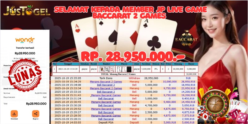 Selamat kepada User ID : YUS***UF Telah berhasil mendapatkan kemenangan besar pada Permainan JP LIVE GAME BACCARAT 2 GAMES Dengan kemenangan Sebesar Rp 28.950.000,- Setelah mengisi formulir withdraw dengan kurung waktu hanya 5-10 menit pihak JUSTOGEL sudah melakukan transfer kepada pemilik User ID dan dana sudah dapat di cairkan oleh pemenang. Bukti pembayaran yang kami berikan merupakan bukti pembayaran yang SAH / VALID yang langung di dapatkan melaui tanda transfer transaksi dari Bank yang di tuju.