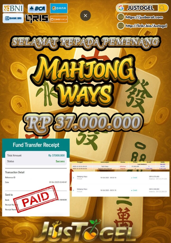 Selamat kepada User ID : YO***ANS Telah berhasil mendapatkan kemenangan besar pada Permainan JP SLOT MAHJONG WAYS Dengan kemenangan Sebesar Rp 37.000.000,- Setelah mengisi formulir withdraw dengan kurung waktu hanya 5-10 menit pihak JUSTOGEL sudah melakukan transfer kepada pemilik User ID dan dana sudah dapat di cairkan oleh pemenang. Bukti pembayaran yang kami berikan merupakan bukti pembayaran yang SAH / VALID yang langung di dapatkan melaui tanda transfer transaksi dari Bank yang di tuju.