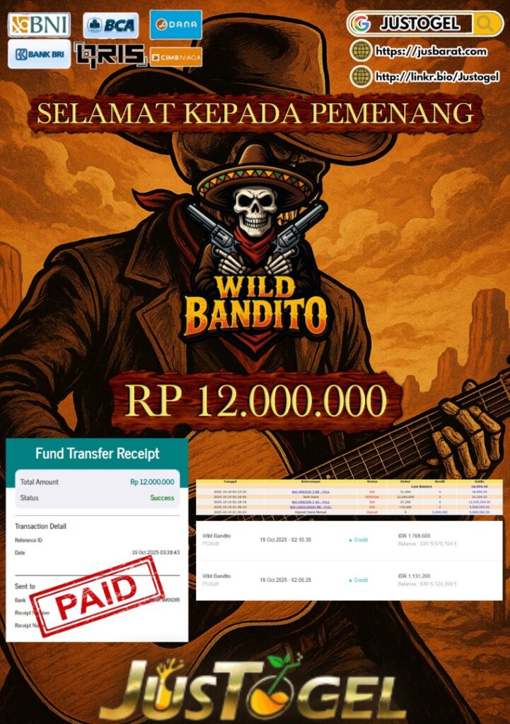 Selamat kepada User ID : CU***AYO Telah berhasil mendapatkan kemenangan besar pada Permainan JP SLOT WILD BANDITO Dengan kemenangan Sebesar Rp 12.000.000,- Setelah mengisi formulir withdraw dengan kurung waktu hanya 5-10 menit pihak JUSTOGEL sudah melakukan transfer kepada pemilik User ID dan dana sudah dapat di cairkan oleh pemenang. Bukti pembayaran yang kami berikan merupakan bukti pembayaran yang SAH / VALID yang langung di dapatkan melaui tanda transfer transaksi dari Bank yang di tuju.