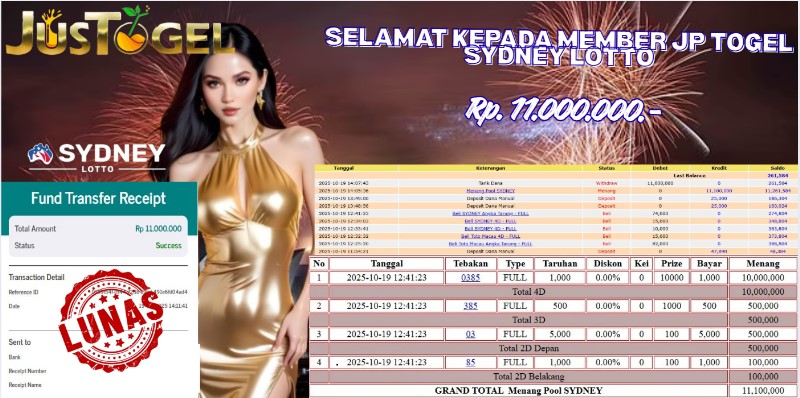 Selamat kepada User ID : GESS***ANG Telah berhasil mendapatkan kemenangan besar pada Permainan JP TOGEL SYDNEY LOTTO Dengan kemenangan Sebesar Rp 11.000.000,- Setelah mengisi formulir withdraw dengan kurung waktu hanya 5-10 menit pihak JUSTOGEL sudah melakukan transfer kepada pemilik User ID dan dana sudah dapat di cairkan oleh pemenang. Bukti pembayaran yang kami berikan merupakan bukti pembayaran yang SAH / VALID yang langung di dapatkan melaui tanda transfer transaksi dari Bank yang di tuju.