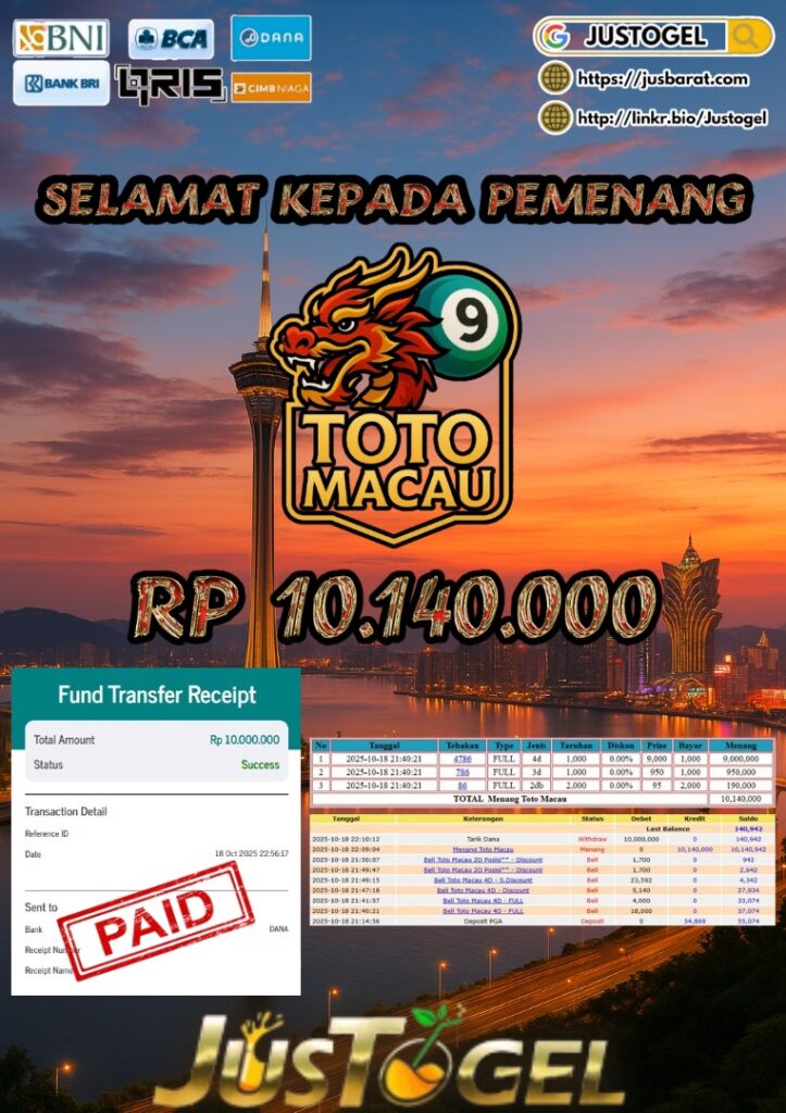 Selamat kepada User ID : PA***NG88 Telah berhasil mendapatkan kemenangan besar pada Permainan JP TOGEL TOTO MACAU Dengan kemenangan Sebesar Rp 10.140.000,- Setelah mengisi formulir withdraw dengan kurung waktu hanya 5-10 menit pihak JUSTOGEL sudah melakukan transfer kepada pemilik User ID dan dana sudah dapat di cairkan oleh pemenang. Bukti pembayaran yang kami berikan merupakan bukti pembayaran yang SAH / VALID yang langung di dapatkan melaui tanda transfer transaksi dari Bank yang di tuju.