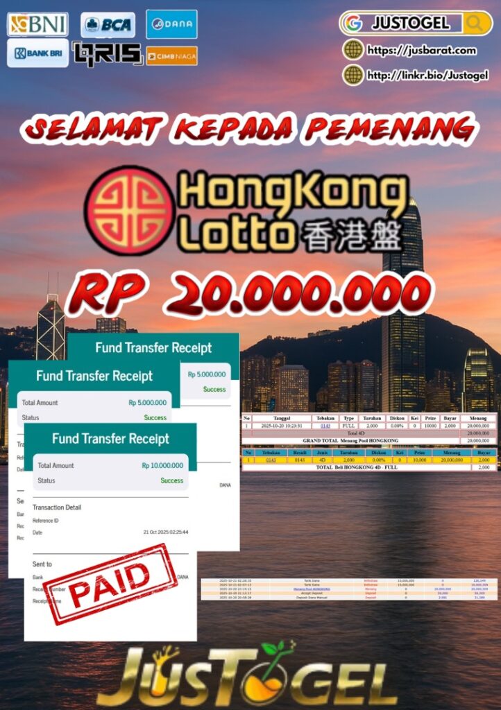 Selamat kepada User ID : BA***OLO Telah berhasil mendapatkan kemenangan besar pada Permainan JP TOGEL HONGKONG LOTTO Dengan kemenangan Sebesar Rp 20.000.000,- Setelah mengisi formulir withdraw dengan kurung waktu hanya 5-10 menit pihak JUSTOGEL sudah melakukan transfer kepada pemilik User ID dan dana sudah dapat di cairkan oleh pemenang. Bukti pembayaran yang kami berikan merupakan bukti pembayaran yang SAH / VALID yang langung di dapatkan melaui tanda transfer transaksi dari Bank yang di tuju.