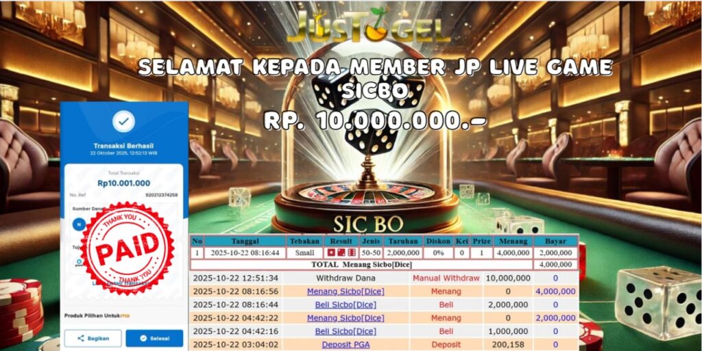 Selamat kepada User ID : JAR***55 Telah berhasil mendapatkan kemenangan besar pada Permainan JP LIVE GAME SICBO Dengan kemenangan Sebesar Rp 10.000.000,- Setelah mengisi formulir withdraw dengan kurung waktu hanya 5-10 menit pihak JUSTOGEL sudah melakukan transfer kepada pemilik User ID dan dana sudah dapat di cairkan oleh pemenang. Bukti pembayaran yang kami berikan merupakan bukti pembayaran yang SAH / VALID yang langung di dapatkan melaui tanda transfer transaksi dari Bank yang di tuju.