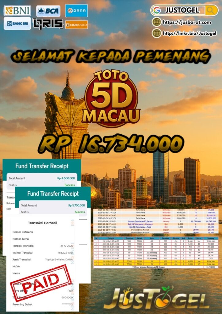 Selamat kepada User ID : PAN***BEN11 Telah berhasil mendapatkan kemenangan besar pada Permainan JP TOGEL TOTO MACAU 5D Dengan kemenangan Sebesar Rp 16.734.000,- Setelah mengisi formulir withdraw dengan kurung waktu hanya 5-10 menit pihak JUSTOGEL sudah melakukan transfer kepada pemilik User ID dan dana sudah dapat di cairkan oleh pemenang. Bukti pembayaran yang kami berikan merupakan bukti pembayaran yang SAH / VALID yang langung di dapatkan melaui tanda transfer transaksi dari Bank yang di tuju.