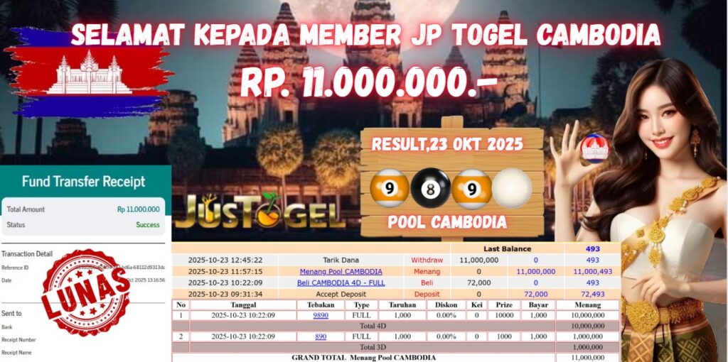 Selamat kepada User ID : BUD**11 Telah berhasil mendapatkan kemenangan besar pada Permainan JP TOGEL CAMBODIA Dengan kemenangan Sebesar Rp 11.000.000,- Setelah mengisi formulir withdraw dengan kurung waktu hanya 5-10 menit pihak JUSTOGEL sudah melakukan transfer kepada pemilik User ID dan dana sudah dapat di cairkan oleh pemenang. Bukti pembayaran yang kami berikan merupakan bukti pembayaran yang SAH / VALID yang langung di dapatkan melaui tanda transfer transaksi dari Bank yang di tuju.