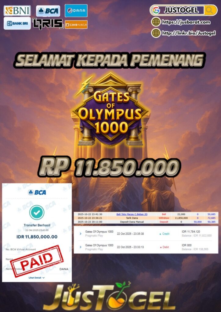 Selamat kepada User ID : GO***KKK Telah berhasil mendapatkan kemenangan besar pada Permainan JP SLOT GATES OF OLYMPUS 1000 Dengan kemenangan Sebesar Rp 11.850.000,- Setelah mengisi formulir withdraw dengan kurung waktu hanya 5-10 menit pihak JUSTOGEL sudah melakukan transfer kepada pemilik User ID dan dana sudah dapat di cairkan oleh pemenang. Bukti pembayaran yang kami berikan merupakan bukti pembayaran yang SAH / VALID yang langung di dapatkan melaui tanda transfer transaksi dari Bank yang di tuju.