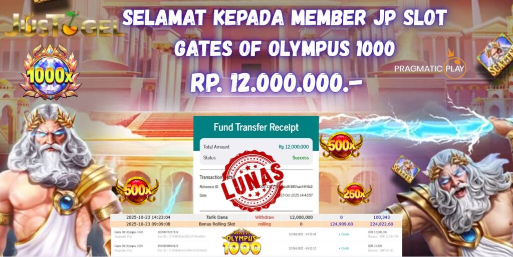 Selamat kepada User ID : NAR***SIH Telah berhasil mendapatkan kemenangan besar pada Permainan JP SLOT GATES OF OLYMPUS 1000 Dengan kemenangan Sebesar Rp 12.000.000,- Setelah mengisi formulir withdraw dengan kurung waktu hanya 5-10 menit pihak JUSTOGEL sudah melakukan transfer kepada pemilik User ID dan dana sudah dapat di cairkan oleh pemenang. Bukti pembayaran yang kami berikan merupakan bukti pembayaran yang SAH / VALID yang langung di dapatkan melaui tanda transfer transaksi dari Bank yang di tuju.