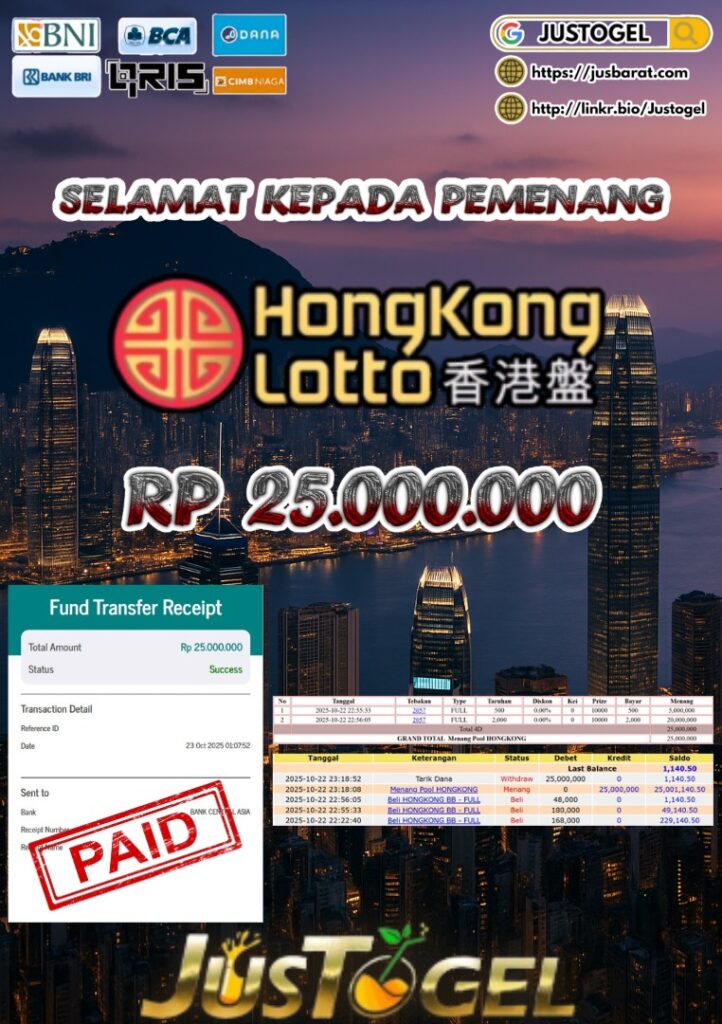 Selamat kepada User ID : LO***UKI22 Telah berhasil mendapatkan kemenangan besar pada Permainan JP TOGEL HONGKONG LOTTO Dengan kemenangan Sebesar Rp 25.000.000,- Setelah mengisi formulir withdraw dengan kurung waktu hanya 5-10 menit pihak JUSTOGEL sudah melakukan transfer kepada pemilik User ID dan dana sudah dapat di cairkan oleh pemenang. Bukti pembayaran yang kami berikan merupakan bukti pembayaran yang SAH / VALID yang langung di dapatkan melaui tanda transfer transaksi dari Bank yang di tuju.
