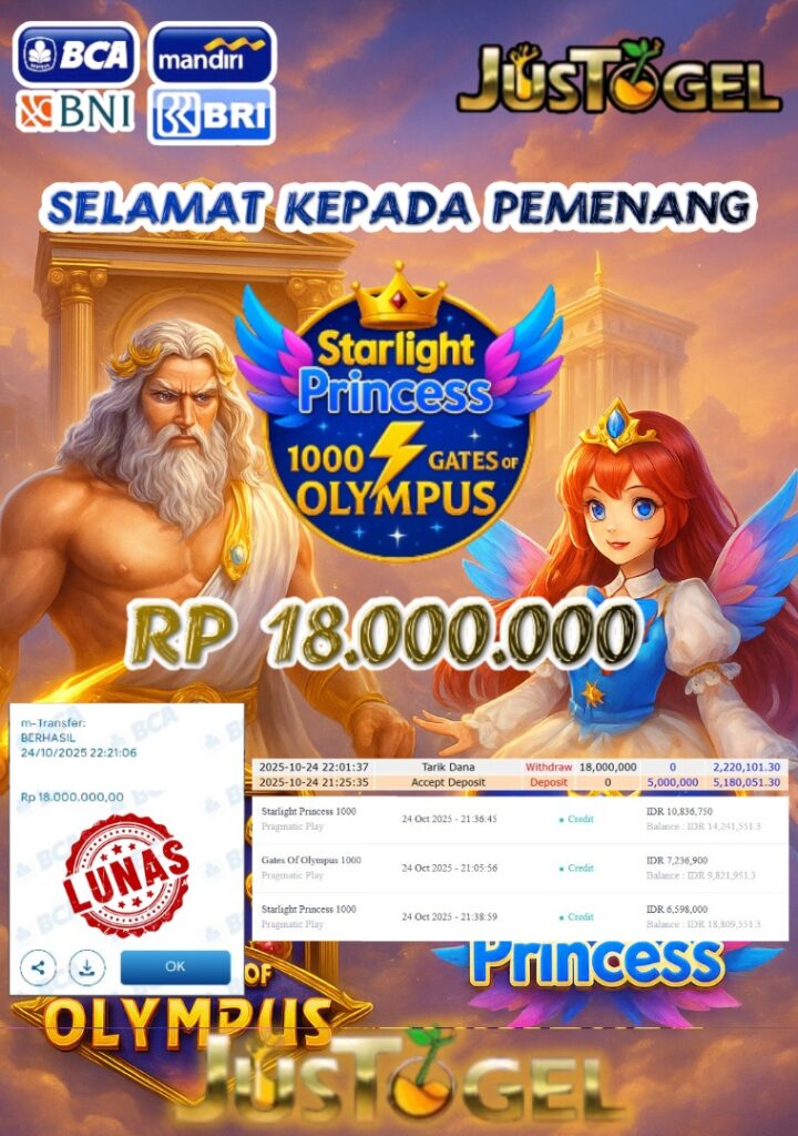 Selamat kepada User ID : NAR***SIH Telah berhasil mendapatkan kemenangan besar pada Permainan JP SLOT GATES OF OLYMPUS 1000 X STARLIGHT PRINCESS 1000 Dengan kemenangan Sebesar Rp 18.000.000,- Setelah mengisi formulir withdraw dengan kurung waktu hanya 5-10 menit pihak JUSTOGEL sudah melakukan transfer kepada pemilik User ID dan dana sudah dapat di cairkan oleh pemenang. Bukti pembayaran yang kami berikan merupakan bukti pembayaran yang SAH / VALID yang langung di dapatkan melaui tanda transfer transaksi dari Bank yang di tuju.