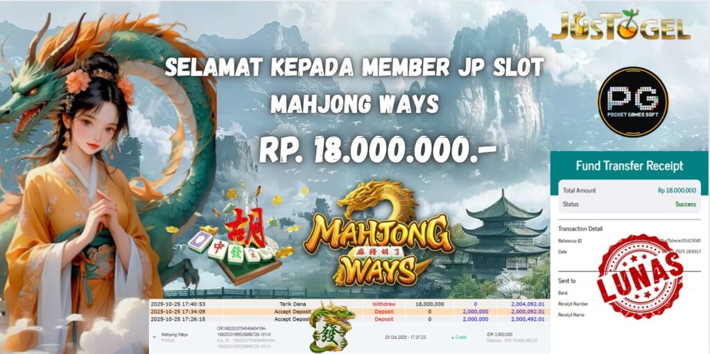 Selamat kepada User ID : ARY***09 Telah berhasil mendapatkan kemenangan besar pada Permainan JP SLOT MAHJONG WAYS Dengan kemenangan Sebesar Rp 18.000.000,- Setelah mengisi formulir withdraw dengan kurung waktu hanya 5-10 menit pihak JUSTOGEL sudah melakukan transfer kepada pemilik User ID dan dana sudah dapat di cairkan oleh pemenang. Bukti pembayaran yang kami berikan merupakan bukti pembayaran yang SAH / VALID yang langung di dapatkan melaui tanda transfer transaksi dari Bank yang di tuju.