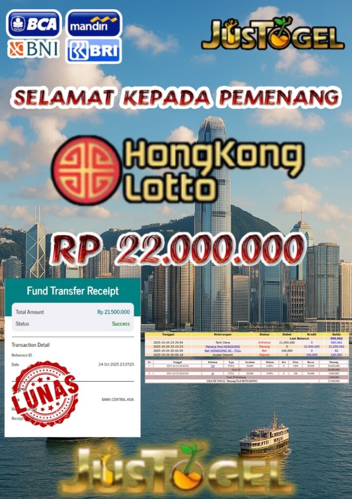 Selamat kepada User ID : WES***OPO Telah berhasil mendapatkan kemenangan besar pada Permainan JP TOGEL HONGKONG LOTTO Dengan kemenangan Sebesar Rp 22.000.000,- Setelah mengisi formulir withdraw dengan kurung waktu hanya 5-10 menit pihak JUSTOGEL sudah melakukan transfer kepada pemilik User ID dan dana sudah dapat di cairkan oleh pemenang. Bukti pembayaran yang kami berikan merupakan bukti pembayaran yang SAH / VALID yang langung di dapatkan melaui tanda transfer transaksi dari Bank yang di tuju.