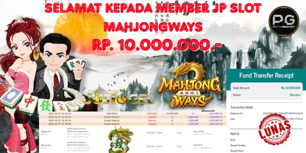 Selamat kepada User ID : ASE***JL Telah berhasil mendapatkan kemenangan besar pada Permainan JP SLOT MAHJONG WAYS Dengan kemenangan Sebesar Rp 10.000.000,- Setelah mengisi formulir withdraw dengan kurung waktu hanya 5-10 menit pihak JUSTOGEL sudah melakukan transfer kepada pemilik User ID dan dana sudah dapat di cairkan oleh pemenang. Bukti pembayaran yang kami berikan merupakan bukti pembayaran yang SAH / VALID yang langung di dapatkan melaui tanda transfer transaksi dari Bank yang di tuju.
