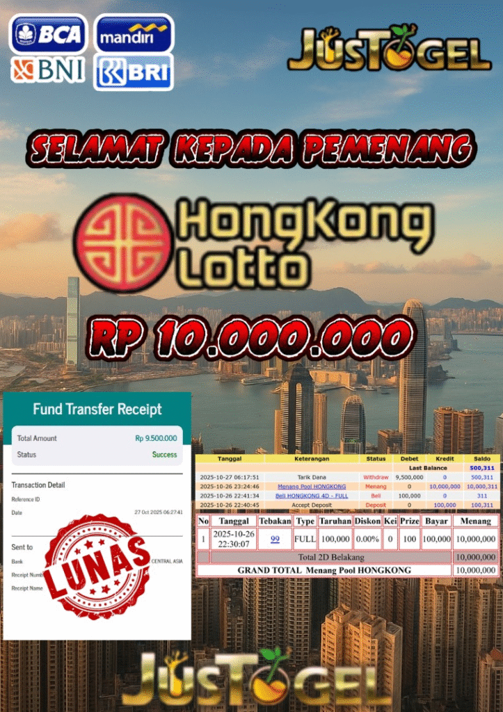 Selamat kepada User ID : BE***AMM Telah berhasil mendapatkan kemenangan besar pada Permainan JP TOGEL HONGKONG LOTTO Dengan kemenangan Sebesar Rp 10.000.000,- Setelah mengisi formulir withdraw dengan kurung waktu hanya 5-10 menit pihak JUSTOGEL sudah melakukan transfer kepada pemilik User ID dan dana sudah dapat di cairkan oleh pemenang. Bukti pembayaran yang kami berikan merupakan bukti pembayaran yang SAH / VALID yang langung di dapatkan melaui tanda transfer transaksi dari Bank yang di tuju.